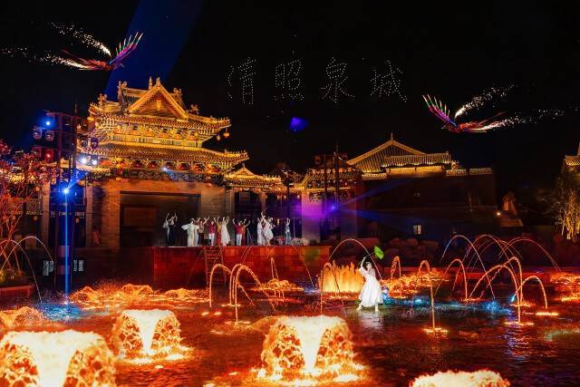黄昏时,在古城内追一场夕阳映泉。远处的天际被晕染成橘粉色,余晖淡淡泼洒在楼阁飞檐之上,令古城平添了几分朦胧的诗意。夜晚的明水古城,檐下的灯笼一盏一盏地亮了,泛着橘黄色的光,将墙壁染成淡橘。喜静的人偏爱小巷,光映在青石板路上,泛着微微的油亮。喜闹的人偏爱演出,若说古城之夜必看节目,那定是泉秀。当喷薄泉涌化作天然的舞台,流光溢彩的灯光与长袖曼妙的古舞交织在一起,水与光共舞,古与今辉映。
